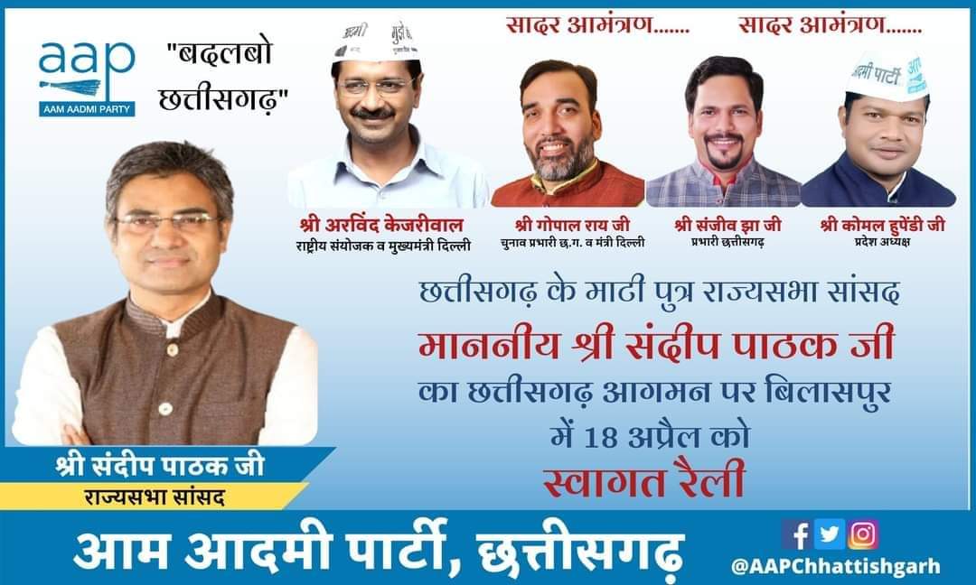आप पार्टी के राज्य सभा सांसद संदीप पाठक का 18 अप्रेल बिलासपुर प्रथम नगर आगमन :-प्रिया शुक्ला (प्रदेश प्रवक्ता आप पार्टी)