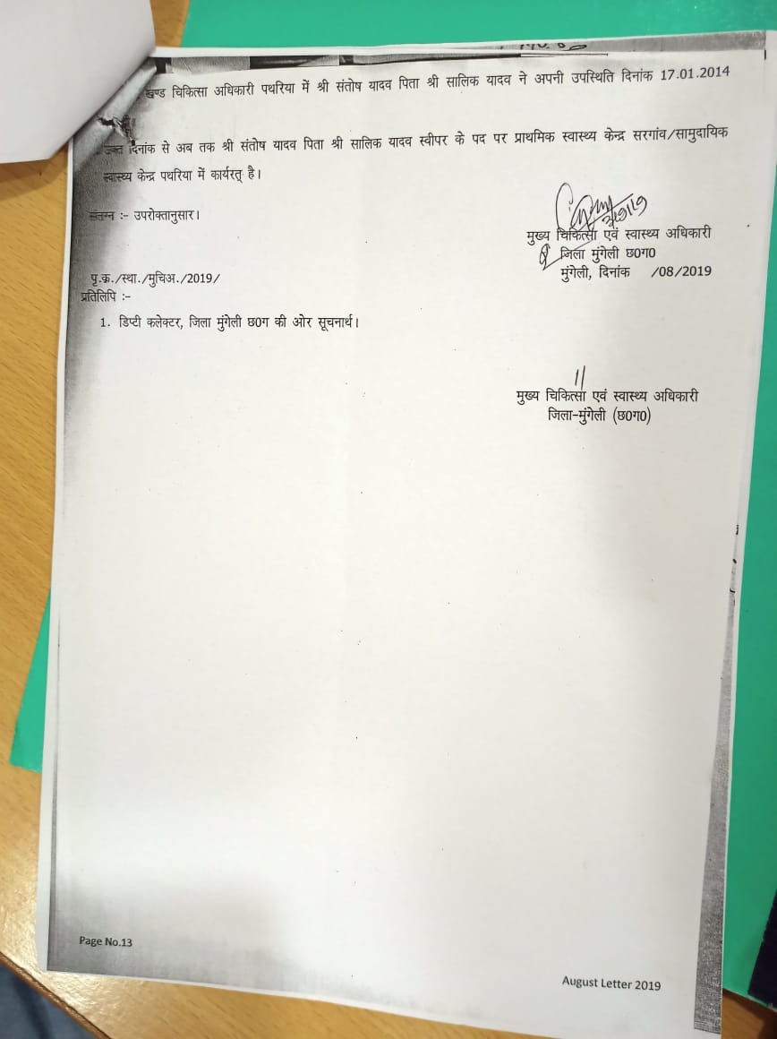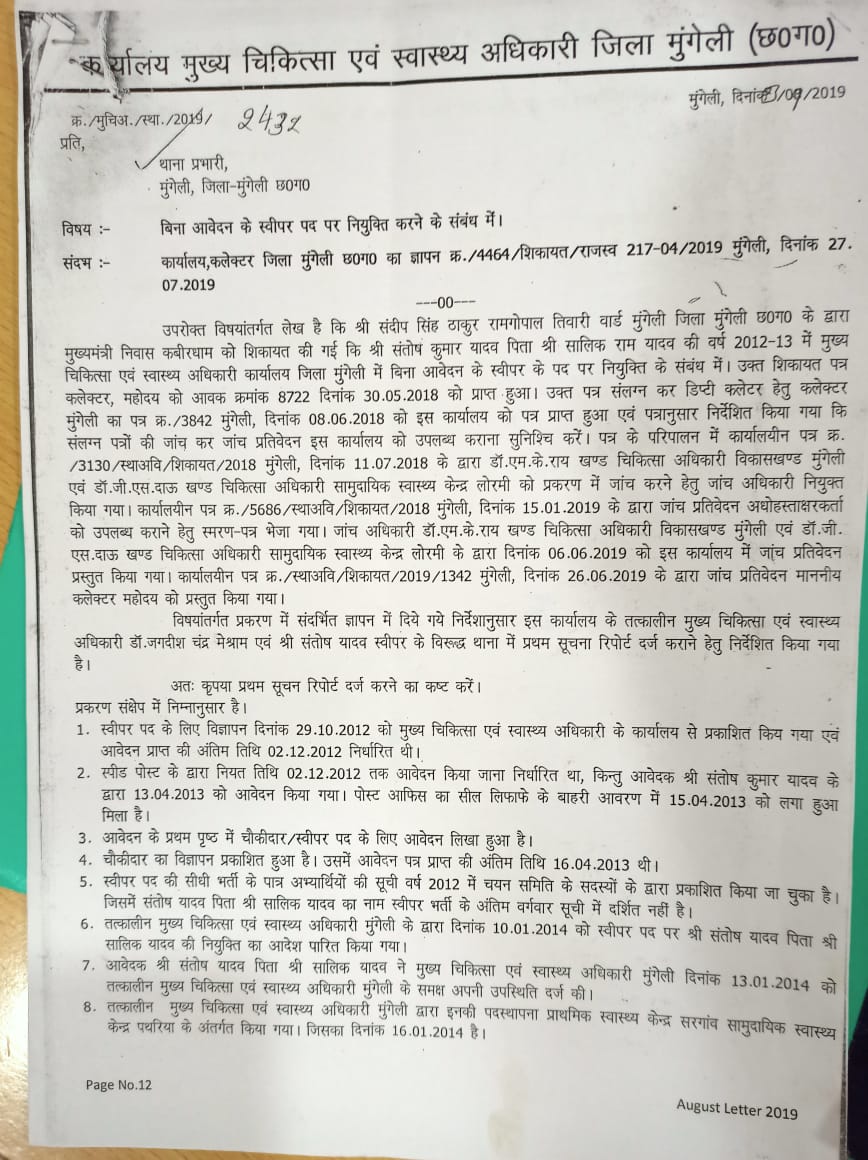 बिना आवेदन कर दी गई थी नियुक्ति – बता दे कि पूर्व cmho ड़ॉ जगदीश चंद्र मेश्राम ने बिना आवेदन के स्वीपर पद पर संतोष कुमार यादव को नियुक्ति दे दी गई थी शिकायतकर्ता ने बाकायदा सबूतों के साथ इसकी शिकायत cm से की cm कार्यालय से कलेक्टर को जॉच के लिए पत्राचार किया गया जांच में पूर्व कलेक्टर ड़ॉ सर्वेश्वर नरेंद्र भूरे ने एफआईआर दर्ज करने का आदेश वर्तमान cmho को जारी किया था, cmho मुख्य चिकित्सा एवं स्वास्थ्य अधिकारी की ओर से एक नही दो नही तीन तीन बार पत्र थाने को प्रेषित किया गया व प्रतिलिपि sp कार्यालय को भी दिया गया लेकिन इसके बाद भी आज दिनांक तक एफआईआर दर्ज नही किया गया है।