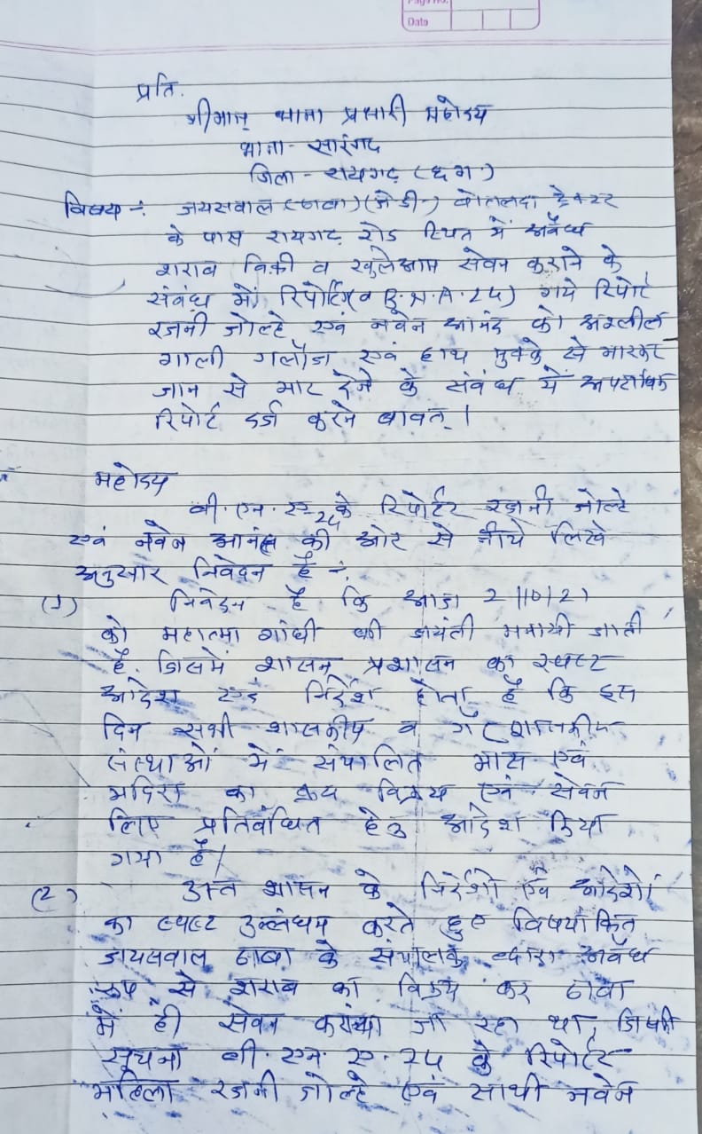 क्या हम महापुरुषों की जयंती का भी सम्मान नही कर सकते? क्या सिर्फ एक दिन के लिए कानून का पालन नही कर सकते? क्या एक दिन के लिए शराब पीने वाले शराब पीना नहीं छोड़ सकते….? क्या एक दिन के लिए पुलिस और आबकारी विभाग और ज्यादा ईमानदारी से काम नहीं कर सकते….?…… इन सभी सवालों का जवाब चंद लोगों के कारण ना है…। क्योंकि मानवता की कमी और पैसे की लालच ने इंसान को अंधा कर दिया है। जिसका जीता-जागता उदाहरण रायगढ़ रोड स्थित जायसवाल ढ़ाबा है। जहां खुलेआम 2 अक्टूबर को दिन दोगुने रेट में शराब बेचा और पिलाया जा रहा है । जो कि आबकारी एक्ट, और गैरकानूनी धाराओं सहित अन्य कानून का उलंघन है।