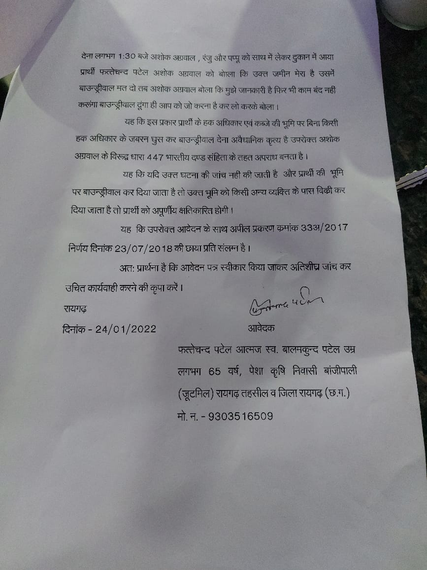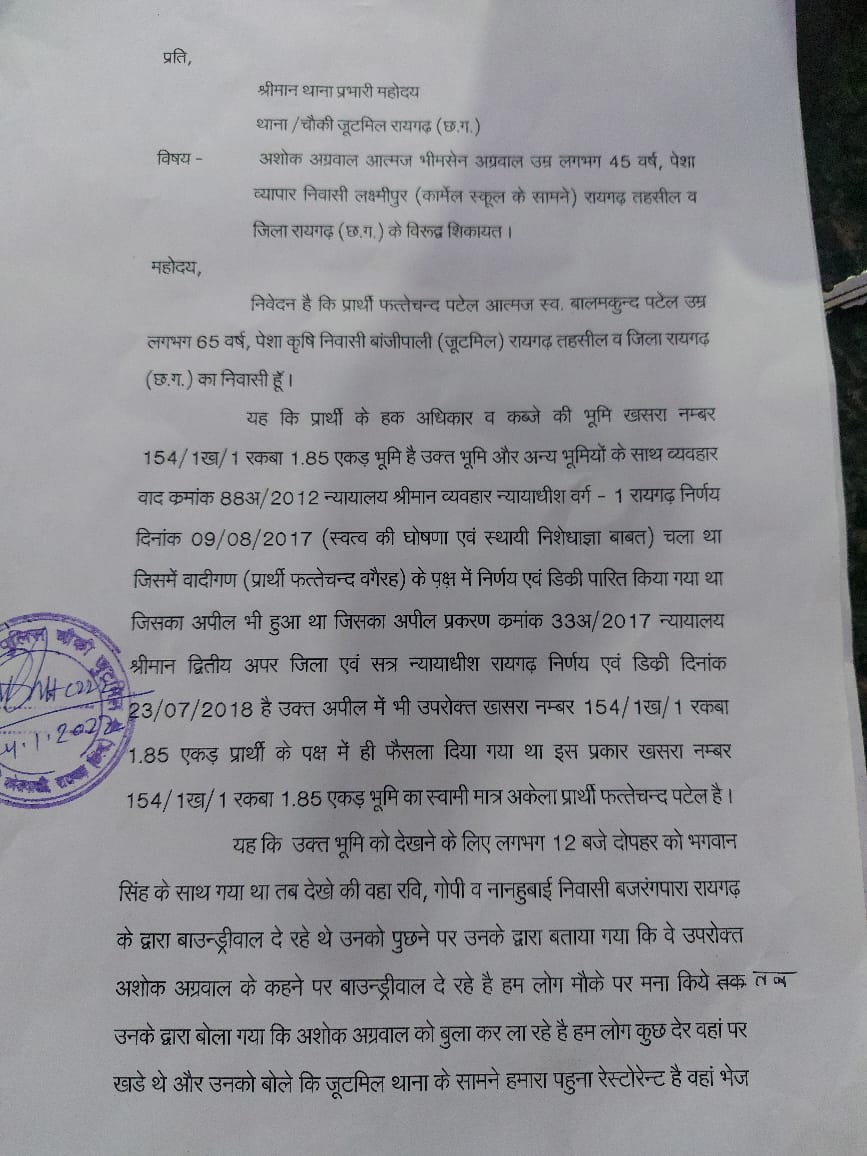 शिकायत पत्र में पीड़ित किसान फत्तेचन्द पटेल पिता स्व बालमुकुंद पटेल निवासी बांझिलपाली ने लिखा है कि कबीर चौक से काशीराम चौक तक जाने वाले मार्ग में दाहिने तरफ उसके हक एवं अधिकार की बेशकीमती भूमि खसरा क्रमांक 154/1ख/1 रकबा1.85 एकड़ भूमि स्थित है। यह भूमि उसके अधिकार में न्यायालीन आदेश क्रमांक 33 अ/ 2017 दिनांक 23 जुलाई 2018 को आई थी। न्ययालय के उक्त आदेश के बाद वह उक्त भूमि का एकमात्र स्वामी है। न्यायालय ने उक्त भूमि पर स्थाई निषेधाज्ञा का आदेश भी दिया हुआ है। प्रार्थी जमीन का स्वामी होने के नाते भूमि पर अब तक वह निर्विघ्न रूप से कब्जे दार भी रहा है। परन्तु बीते दिनों शहर की कई एकड़ जमीनों की हेराफेरी और अवैध खरीद-फरोख्त में संलिप्त रहकर लाखों करोड़ों रुपये कमाने वाले एक रसूखदार भूमाफिया और जमीन कारोबारी अशोक अग्रवाल पिता भीमसेन अग्रवाल निवासी लक्ष्मीपुर की नजर उनकी इस जमीन पर पड़ गई। जिसके बाद उसने उक्त भूमि पर कब्जा करने का प्रयास प्रारम्भ कर दिया।