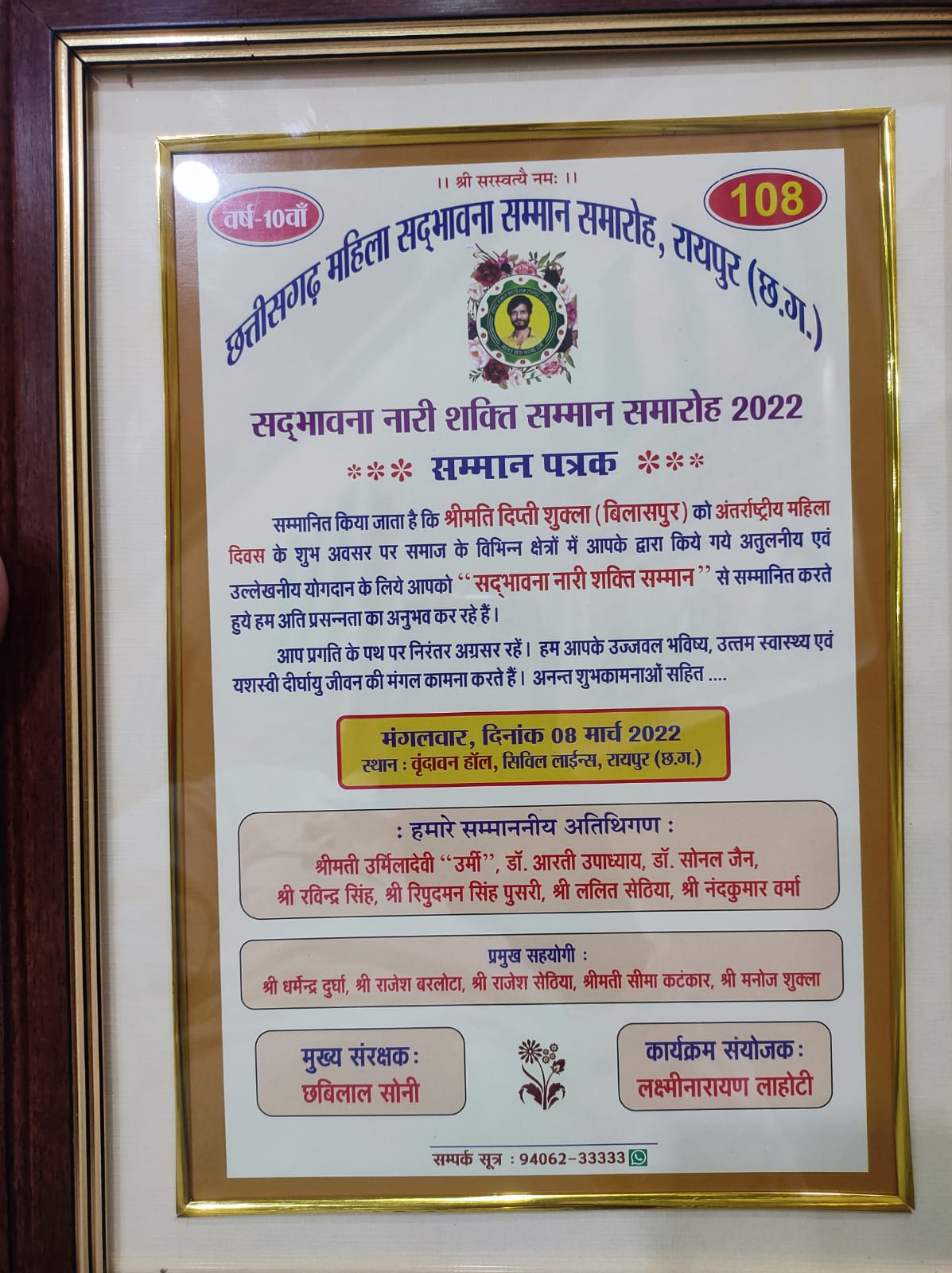 बिलासपुर/रायपुर-: छत्तीसगढ़ महिला सदभावना सम्मान समरोह रायपुर में अंतरराष्ट्रीय महिला दिवस के उपलक्ष्य में बिलासपुर की नारी शक्ति श्रीमती दीप्ती अनिल शुक्ला का समाज के विभिन्न कार्य क्षेत्रो अपूर्णीय योगदान देने के लिए सम्मान से नवाजा गया है जिससे बिलासपुर शहर ही नही जिले का भी सम्मान हुआ है । श्रीमती दीप्ति शुक्ला समाजसेवी एवं कांग्रेस नेता श्री अनिल शुक्ला जी की धर्मपत्नी है और श्रीमती अनिल शुक्ला समाज सेवा में हमेशा से आगे रही है वो चाहे कोरोना वरियर्स बन कर या किसी अन्य सामाजिक कार्यो में बढ़चढ़ कर हिस्सा लिया इसी कार्य को देखते हुए श्रीमती दीप्ति अनिल शुक्ला का रायपुर में सम्मान किया गया।