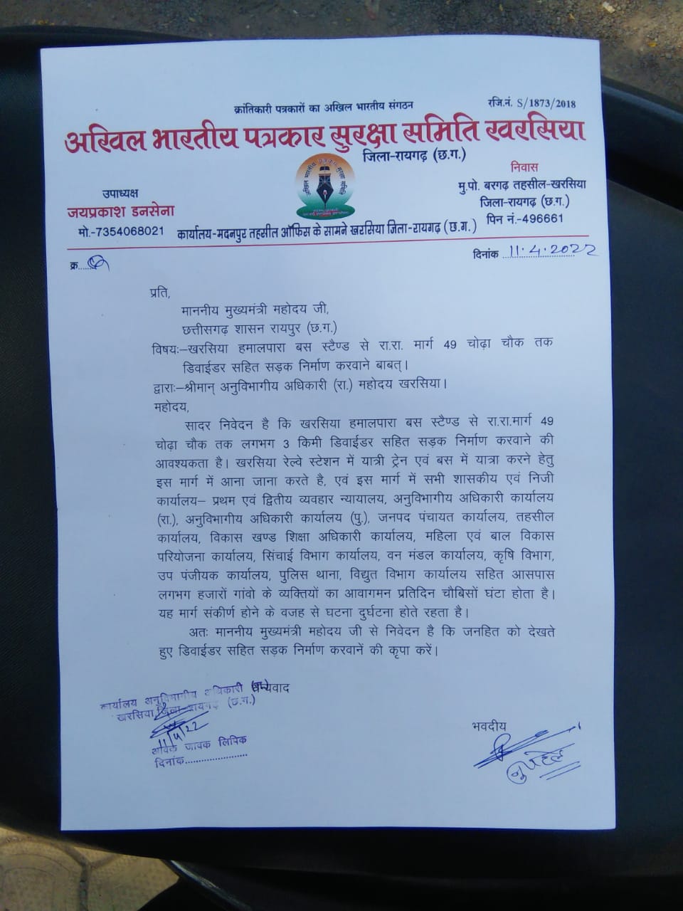 डिवाईडर सहित सड़क निर्माण करवाने अखिल भारतीय पत्रकार सुरक्षा समिति इकाई के उपाध्यक्ष जयप्रकाश डनसेना ने मुख्यमंत्री भूपेश बघेल के नाम खरसिया SDM को सौंपा ज्ञापन