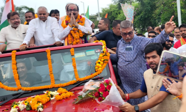 रायपुर-: भारतीय जनता पार्टी के नवनियुक्त प्रदेश अध्यक्ष बिलासपुर लोकसभा सांसद अरुण साव जी के नवनियुक्त प्रदेश अध्यक्ष बनने के उपरांत आज दिनांक 13 अगस्त शनिवार दोपहर 1:30 बजे रायपुर विवेकानंद विमानतल में छत्तीसगढ़ भारतीय जनता पार्टी के कार्यकर्ताओं के द्वारा पूरे जोश खरोश के साथ भव्य स्वागत सत्कार नंदन वंदन अभिनंदन किया गया स्वागत समारोह में मोटरसाइकिल रैली गाड़ियों का काफिला विशेष कर्मा कृत्य पंथी नृत्य रावत नाच के साथ-साथ धुमाल की धुन में तिरंगे के साथ भारतीय जनता पार्टी के नेता और कार्यकर्ताओं ने अपने नवनियुक्त प्रदेश अध्यक्ष का स्वागत किया बिलासपुर नगर से भी बड़ी संख्या में भारतीय जनता पार्टी के कार्यकर्ता पदाधिकारी के साथ-साथ तखतपुर मुंगेली लोरमी कोटा मस्तूरी पेंड्रा गौरेला बेलतरा इन सभी क्षेत्रों से कार्यकर्ता बड़ी संख्या में रायपुर पहुंच कर प्रदेश अध्यक्ष के स्वागत समारोह में शामिल हुए रायपुर एयरपोर्ट से रैली की शक्ल में भारतीय जनता पार्टी एकात्म परिसर कार्यालय तक भव्य शोभायात्रा के रूप में जगह जगह स्वागत प्रदेश अध्यक्ष का किया गया पूरा शहर रायपुर प्रदेश अध्यक्ष के स्वागत के लिए भारतीय जनता पार्टी के कार्यकर्ता युवा मोर्चा महिला मोर्चा समस्त मोर्चा प्रकोष्ठ के बंधु पूरे जोश खरोश के साथ मिशन 2023 के लिए नवनियुक्त प्रदेश अध्यक्ष के स्वागत में शामिल हुए,,🙏
