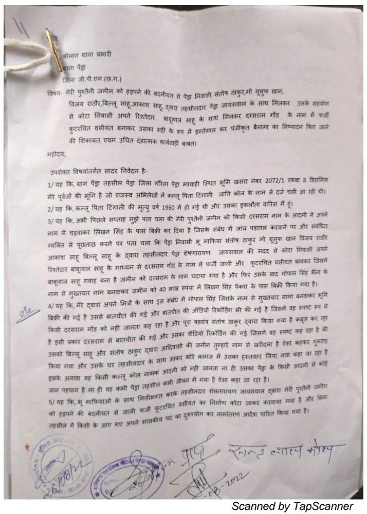 स्थित भूमि खसरा नंबर 2072/1 रकबा 8 डिसमिल जो शिकायतकर्ता के पूर्वजों की भूमि है जो राजस्व अभिलेखों में कल्लू पिता टिंगाली जाति कोल के नाम से दर्ज होती चली आ रही है . वही कल्लू पिता टिंगाली की मृत्यु वर्ष 1960 में हो गई थी और उसका इकलौता वारिस संतलाल कोल है . संतलाल कोल ने अपनी शिकायत में बताया कि उसे पिछले सप्ताह पता चला की उसकी पुश्तैनी जमीन को किसी दरसराम नाम के आदमी ने अपने नाम में चढ़वाकर लिखन सिंह के पास बिक्री कर दिया है जिसके संबंध में जांच पड़ताल करवाने पर और संबंधित व्यक्ति से पूछताछ करने पर पता चला कि पेण्ड्रा निवासी भू माफिया संतोष ठाकुर, मो यूसुफ खान, विजय राठौर, आकाश साहू, बिल्लू साहू, के द्वारा तहसीलदार पेण्ड्रा शेषणारायण जायसवाल की मदद से कोटा निवासी अपने रिश्तेदार बाबूलाल साहू के माध्यम से दरसराम गोंड के नाम से फर्जी जाली और कूटरचित वसीयत बनाकर जिसमे बाबूलाल साहू गवाह बना है जमीन को दरसराम के नाम चढ़ाया गया है और फिर उसके बाद गोपाल सिंह भैना के नाम से मुख्तयार नाम बनवाकर जमीन को 40 लाख रुपया में लिखन सिंह पैकरा के पास बिक्री किया गया है।