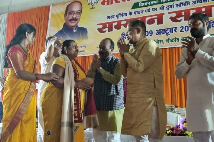 दशहरा मिलन एवं दुर्गोत्सव समितियों के सम्मान समारोह में मुख्य अतिथि सांसद और भाजपा प्रदेष अध्यक्ष श्री अरुण साव ने प्रदेशवासियों को त्योहारों की पावन श्रृंखला के लिए अपनी शुभकामनाएं देते हुए सुख और समृद्धि सर्व समुदाय के कल्याण की कामना की। उन्होंने कहा श्रद्धालुओं का उत्साह व लगन हमारी संस्कृति की अनूठी मिसाल है। समारोह में श्रीमती शशि अमर अग्रवाल आदित्य अग्रवाल सहित बिलासपुर भाजपा के समस्त मंडल एवं बूथ स्तर के कार्यकर्ता पदाधिकारी प्रबद्ध नागरिक विभिन्न मोर्चों के प्रभारी भाजपा पार्षद दल के सदस्त आदि शामिल हुए। आयोजन को सफल बनाने में महत्वपूर्ण गुलशन ऋषि,जिलाध्यक्ष रामदेव कुमावत, प्रवीण दुबे, मकबूल खान, मनीष अग्रवाल ुवा मोर्चा के जिलाध्यक्ष निखिल केशरवानी, दीपक सिंह,शैलेंद्र यादव,रौशन सिंह , पंकज तिवारी, विजय सिंह, जुगल अग्रवाल, अरविंद बोलर,अजीत भोगल, निम्मा जीवनानी चंद्र प्रकाश मिश्रा, संदीप दास,वैभव गुप्ता, मोनू रजक, आशीष तिवारी, नितिन छाबड़ा, महर्षि बाजपेई, मुकेश राव आदि ने महत्वपूर्ण भूमिका निभाई।