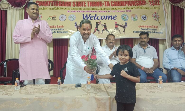 बिलासपुर-: राज्य स्तरीय थांग-ता मार्शल आर्ट प्रतियोगिता उद्घाटित छत्तीसगढ़ थांग-ता संघ बिलासपुर द्वारा 15 एवं 16 अक्टूबर को सीएमडी कॉलेज ऑडिटोरियम में राज्य स्तरीय थांग-ता मार्शल आर्ट प्रतियोगिता आयोजित कर रहा है प्रतियोगिता का उद्घाटन महापौर श्री रामशरण यादव जी एवं कार्यक्रम की अध्यक्षता नगर निगम के सभापति श्री शेख नजिरुद्दीन जी ने किया एवं विशिष्ट अतिथि के रूप में योग आयोग के सदस्य श्री रविंद्र सिंह जी, कांग्रेस नेता श्री आशीष गोयल जी के उपस्थिति में प्रतियोगिता का उद्घाटन हुआ प्रतियोगिता के विषय में जानकारी देते हुए संघ के प्रदेश अध्यक्ष शेख समीर न बताया कि प्रतियोगिता में प्रदेश के 11 जिलों के 200 से अधिक खिलाड़ि कोच मैनेजर रैफरी भाग ले रहे हैं प्रतियोगिता में पदक प्राप्त करने वाले खिलाड़ीयो का चयन आगामी राष्ट्रीयता मार्शल आर्ट प्रतियोगिता तमिलनाडु कन्याकुमारी के लिये की जाएगी प्रतियोगिता को सफल बनाने के लिए संघ के महासचिव घनश्याम सिंह,रमेश शर्मा,एसएम रिजवान,जितेंद्र साहू,ठाकुर करण सिंह,अशोक वर्मा,जावेद कोसले,ईश्वर टोंडर,संदीप कुर्रे,ईश्वर बर्मन,अरबाज अली आदि अपना योगदान दे रहे हैं..