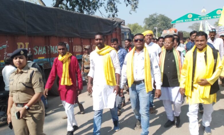 सारंगढ खेल मैदान समाज के पदाधिकारियों ने सबसे पहले भगवान विरसा मुण्डा जी एवं प्रकृति देव बूढ़ा देव की पुजा अर्चना कर रैली सर्व आदिवासी समाज जिला अध्यक्ष रामनाथ सिदार के नेतृत्व में भारत माता चौक के पास आर्थिक नाकेबंदी चक्का जाम करने निकले । और 3 घंटे तक भारत माता चौक सारंगढ जाम कर आदिवासीओ ने जमकर गरजे।
