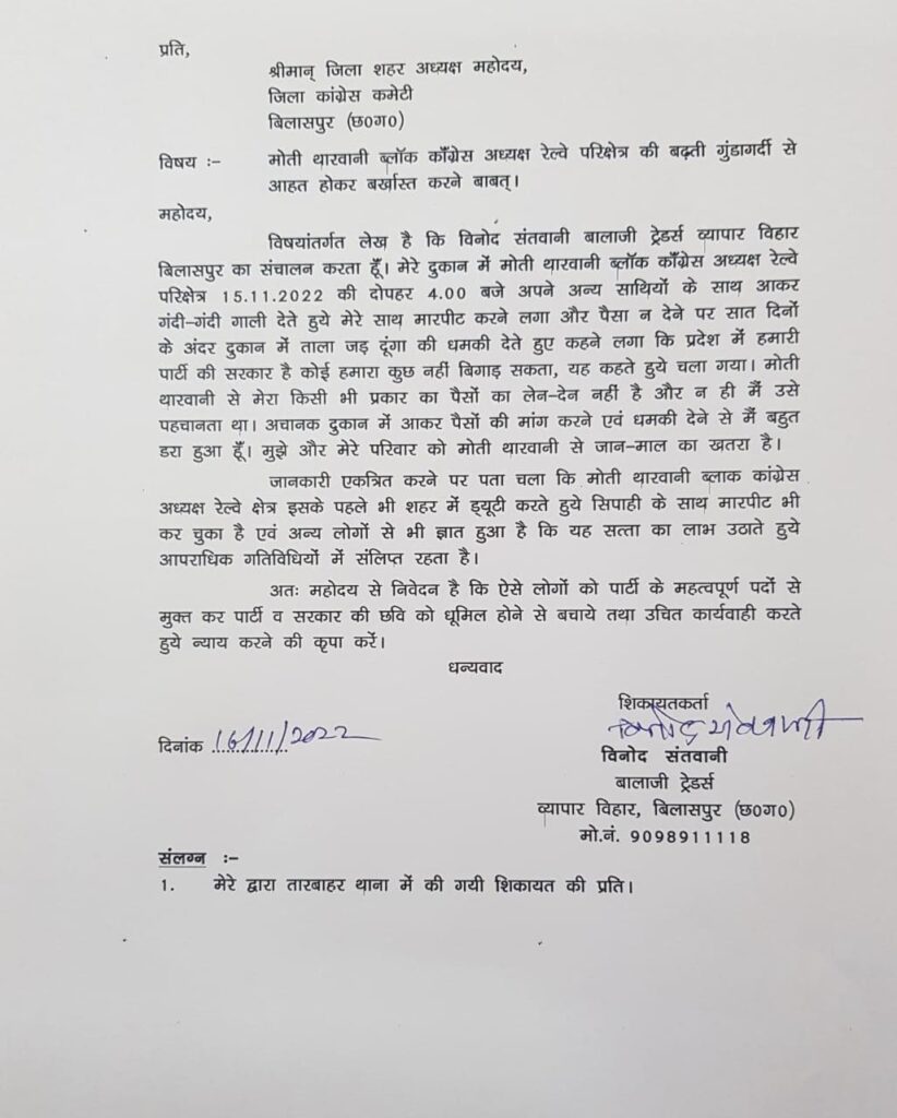 बिलासपुर:- विगत दिनों व्यापारी के साथ उसकी दुकान में घुस कर गाली गलौज करने दुकान में ताला लगाने की धमकी देने वाला कांग्रेस नेता मोती थारवानी ब्लॉक कांग्रेस अध्यक्ष की धमकी से परेशान व्यापारी विनोद संतवानी ने कांग्रेस शहर अध्यक्ष विजय पांडेय से शिकायत की हैं व्यापारी ने कांग्रेस शहर अध्यक्ष से अपनी सुरक्षा को लेकर आशंका जताई कि मोती थारवानी कांग्रेस नेता द्वारा किए गए कृत्य से वे और उनका परिवार डरा हुआ हैं और उन्हें डर हैं की उनके साथ फिर मारपीट की घटना हों सकती हैं मोती थारवानी द्वारा कांग्रेस पार्टी की भी छवि खराब किया जा रहा हैं मोती थारवानी द्वारा उन्हें खुलेआम हमारी सरकार होने की धमकी दी हैं मेरा कोई कुछ नही बिगाड़ सकता कहता है मैने पुलिस वालो को भी मारा है मेरी पार्टी की सरकार है शहर अध्यक्ष से अनुरोध किया है कि ऐसे कार्यकर्ताओं के चलते पार्टी बदनाम होती है ऐसे व्यक्ति को पद से तुरंत हटाए और उन्हें सुरक्षा मुहैया कराएं।