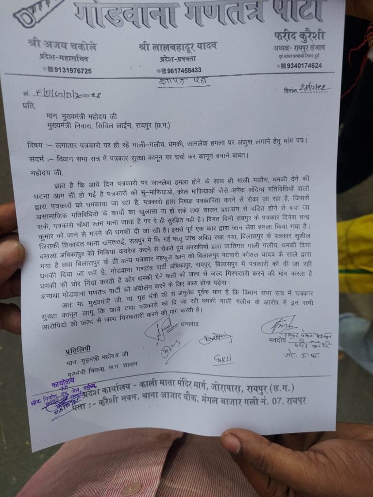 गोंडवाना गणतत्रं पार्टी ने कहा प्रदेश मे पत्रकारो पर हो रहे अत्याचार पर पाबंदी लगे ।