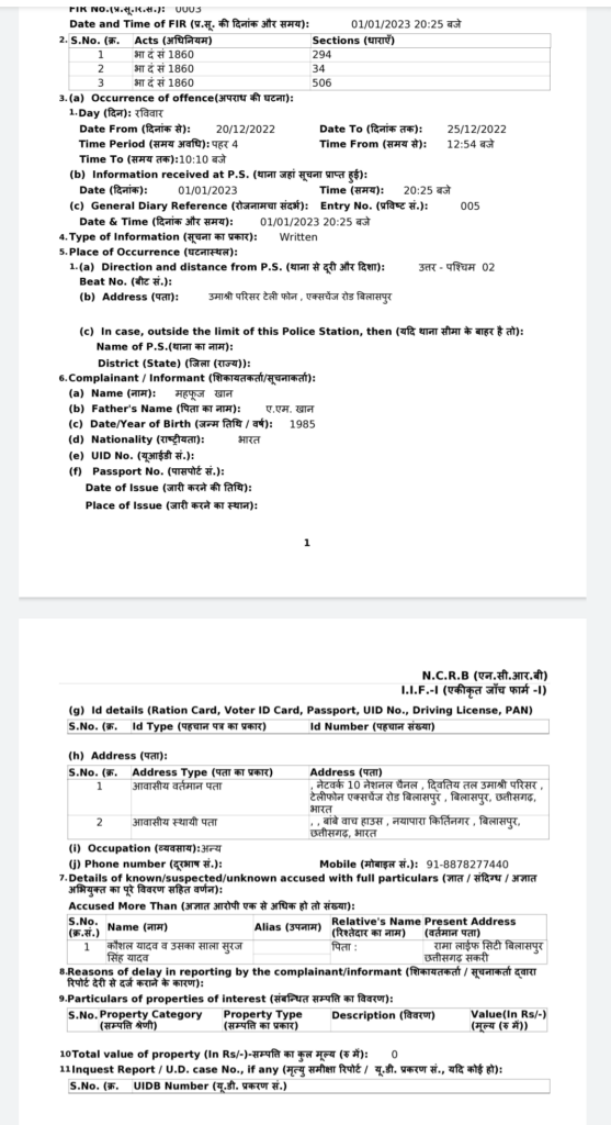 पत्रकार महफूज खान ने थाने मे शिकायत दर्ज कराया था जिसमें बताया की उन्होंने पटवारी कौशल यादव एवं उसका साला सूरज सिंह यादव का साक्ष्यों के आधार पर खबर प्रकाशित किया था जिसको लेकर पटवारी एवं उसके साले ने मुझे वाट्सप चैट,फोन के माध्यम से धमकी दी जिसकी शिकायत थाने मे दर्ज कराया गया था।