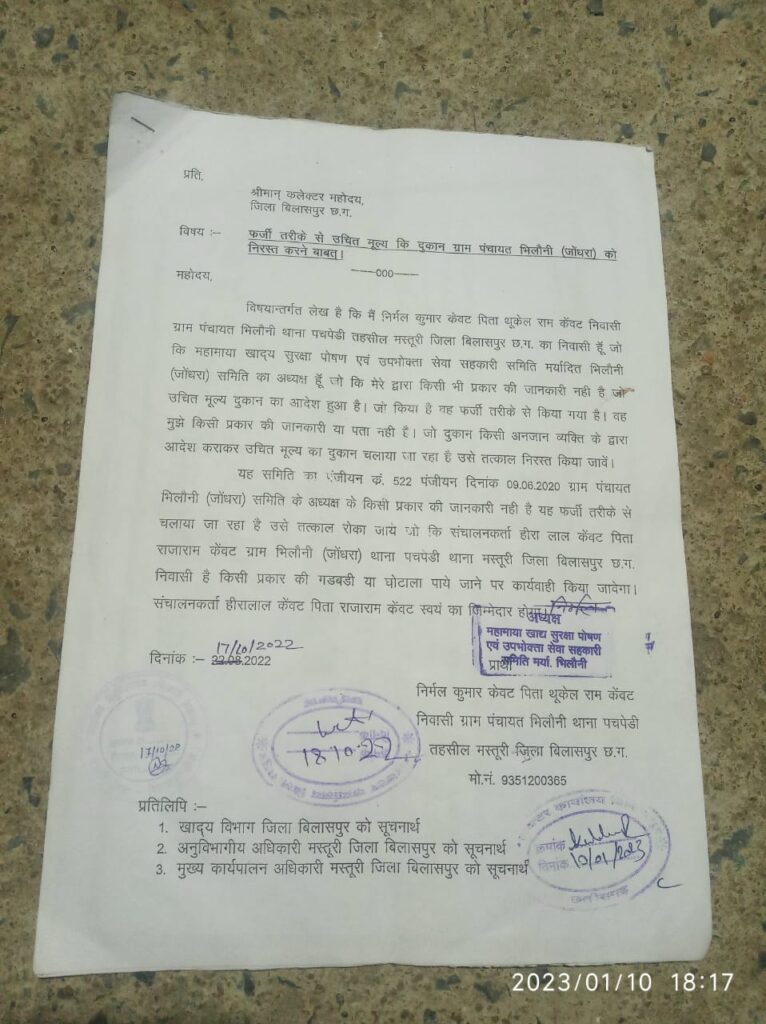 फर्जी तरीके से उचित मूल्य कि दुकान ग्राम पंचायत भिलौनी ( जोंधरा ) को निरस्त करने विषयान्तर्गत लेख है कि में निर्मल कुमार केवट पिता थूकेल राम केवट निवासी ग्राम पंचायत भिलौनी थाना पचपेड़ी तहसील मस्तूरी जिला बिलासपुर छग का निवासी हूँ जो कि महामाया खाद्य सुरक्षा पोषण एवं उपभोक्ता सेवा सहकारी समिति मर्यादित भिलौनी ( जोंधरा ) समिति का अध्यक्ष हूँ जो कि मेरे द्वारा किसी भी प्रकार की जानकारी नहीं है जो उचित मूल्य दुकान का आदेश हुआ है । जो किया है वह फर्जी तरीके से किया गया है । वह मुझे किसी प्रकार की जानकारी या पता नहीं है । जो दुकान किसी अनजान व्यक्ति के द्वारा आदेश कराकर उचित मूल्य का दुकान चलाया जा रहा है उसे तत्काल निरस्त किया जावें । यह समिति का पंजीयन क्रं . 522 पंजीयन दिनांक 09.06.2020 ग्राम पंचायत भिलौनी ( जोधरा ) समिति के अध्यक्ष के किसी प्रकार की जानकारी नहीं है यह फर्जी तरीके से चलाया जा रहा है उसे तत्काल रोका जाये जो कि संचालनकर्ता हीरा लाल केंवट पिता राजाराम केवट ग्राम भिलौनी ( जोंधरा ) थाना पचपेडी थाना मस्तूरी जिला बिलासपुर छ.ग. निवासी है किसी प्रकार की गडबडी या घोटाला पाये जाने पर कार्यवाही किया जायेगा । संचालनकर्ता हीरालाल केंवट पिता राजाराम केंवट स्वयं का जिम्मेदार होत महामाया खाद्य सुरक्षा पोषण एवं उपभोक्ता सेवा सहकारी । प्राथमिति मर्या . भिलौनी 17/20/2022 दिनांक : – 2208 2022 2011-20 181025 w * निर्मल कुमार केवट पिता थूकेल राम केंवट निवासी ग्राम पंचायत भिलौनी थाना पचपेडी तहसील मस्तूरी जिला बिलासपुर छ.ग.. प्रतिलिपि : 1. खादय विभाग जिला बिलासपुर को सूचनार्थ 2. अनुविभागीय अधिकारी मस्तूरी जिला बिलासपुर को सूचना ✓ 3. मुख्य कार्यपालन अधिकारी मस्तूरी जिला बिलासपुर को सूचनार्थ दिनांक