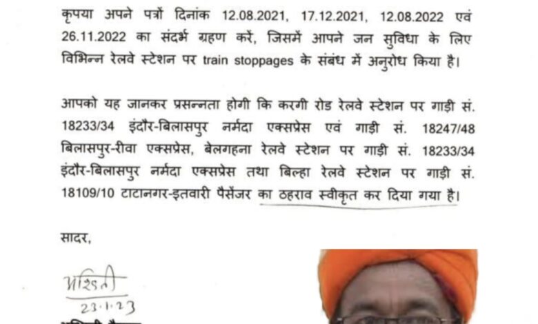 भाजपा प्रदेश अध्यक्ष एवं बिलासपुर सांसद अरुण साव के लगातार प्रयासों से रेल में यात्रा करने वाले मुसाफिरों को आज भारी राहत मिली है । अरुण साव ने अपने पत्रों के माध्यम से लगातार दिनाँक 12-08-21 , 17-12-21 , 12-08-21 एवं 26-11-22 को रेलमंत्री और रेल्वे अधिकारियों से विभिन्न ट्रेनों के ठहराव की मांग की थी । जिसे रेलमंत्री अश्वनी वैष्णव ने गम्भीरता से लेते हुए 4 ट्रेनों के ठहराव की स्वीकृति दी है । करगीरोड स्टेशन में गाड़ी न. 18233/34 इंदौर-बिलासपुर नर्मदा एक्सप्रेस एवं गाड़ी न. 18247/48 बिलासपुर-रीवा एक्सप्रेस , बेलगहना स्टेशन में गाड़ी न. 18233/34 इंदौर-बिलासपुर नर्मदा एक्सप्रेस तथा बिल्हा स्टेशन में गाड़ी न. 18109/10 टाटानगर-इतवारी पैसेंजर का ठहराव स्वीकृत किया है । इन विभिन्न छोटे रेलवे स्टेशनो पर मिले ट्रेनों के ठहराव से प्रतिदिन यात्रा करने वाले हजारों मुसाफिरों को भारी राहत मिलेगी जिसका श्रेय क्षेत्रीय सांसद अरुण साव को जाता है जिन्होंने लगातार अपने पत्रों और रेलमंत्री व रेलवे के अधिकारियों से व्यक्तिगत मुलाकात के माध्यम से रेलमंत्री और रेलवे के अधिकारियों को मुसाफिरों को हो रही समस्याओं से अवगत कराया और उसी के कारण आज 4 ट्रेनों के ठहराव की स्वीकृति रेलमंत्री ने प्रदान की जिससे प्रतिदिन यात्रा करने वाले हजारों यात्रियों को फायदा मिलेगा ।।