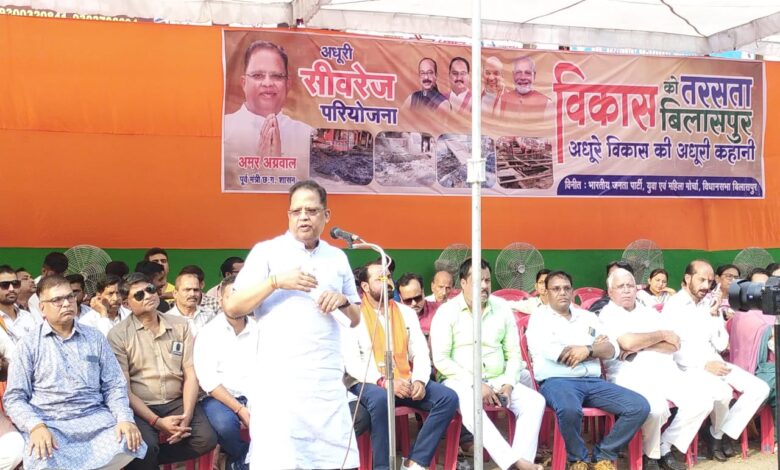 विकास को तरसता बिलासपुर अधूरे शहर की अधूरी कहानी अभियान के अंतर्गत पूर्व मंत्री अमर अग्रवाल ने अधूरी सीवरेज परियोजना के विरोध में शनिचरी में निर्माणाधीन ज्वाली कुआं पंपिंग स्टेशन के समीप धरना देते हुए कहा कि- जनता की सुविधा हर जनप्रतिनिधि की प्राथमिकता होती है, जनहित मे राजनीतिक लाभ की सोच बाधा नही होनी चाहिए। बढ़ते शहरीकरण के आधुनिक दौर में नगरीय नियोजन के मद्देनजर सीवरेज ट्रीटमेंट हर शहर के लिए अनिवार्य अंग है, प्राथमिक आवश्यकता है। 2003 में भाजपा की सरकार बनी, उस समय भावी पीढ़ी की आवश्यकताओं को देखते हुए सीवरेज परियोजना की संकल्पना हेतु प्रयास आरंभ किए गए। 307 करोड़ रुपए की लागत से शहर के 80% इलाके में तीन लाख 29 हजार आबादी को लाभान्वित करने के सीवरेज परियोजना स्वीकृति दिलाई गई। अमर अग्रवाल ने कहा आजादी के बाद सात दशकों में बिलासपुर के विकास के लिए राशि भी नहीं मिली हमने 300 करोड़ की योजना भाजपा सरकार बनते ही स्वीकृत कराई। शहर विकास से संबंधित जारी सीवरेज एवं अन्य परियोजना कार्यो से ही स्मार्ट सिटी के लिए 100 शहरों में बिलासपुर का चयन हुआ जिसके लिए 4000 करोड़ रुपए शहर विकास के लिए आए। अमृत मिशन के लिए 300 करोड़ रुपए आए। सड़क बिजली पानी की मूलभूत आवश्यकता सतत सुलभ कराने के बावजूद अरबन मॉर्डनाइजेशन के मानकों में बिलासपुर को आगे लाने के लिए नए नए प्रोजेक्ट आरम्भ कराए गए, जिसके परिणाम आम जनता को दिखाई देते हैं, हमारी सरकार के समय तेजी से जारी कार्यो से बहुत दिनों बाद आने वाले लोगों को बिलासपुर कायाकल्प का विकास दिखाई देता था। सीवरेज पूर्ण होने से रोगों की रोक-थाम एवं पर्यावरण संरक्षा, मच्छर मुक्त शहर, मल-जल की निकासी, जलभराव की समस्या से मुक्ति, दूषित जल का उपचार, कृषि और बागवानी के खाद निर्माण आदि लाभ हो सकेंगे। डर्क वालथर (जर्मन विशेषज्ञ) ने कहा शहरी क्षेत्रों में मलजल अनेक रोगों का कारक होता है। पैरिस तथा कोलकाता में गंभीर समस्या एवं क्षति होने के बाद ही भूमिगत सीवरेज लगभग 150 वर्ष पूर्व प्रारंभ किया गया था। बिलासपुर में समय रहते हुए पहल प्रारंभ की गई है।
