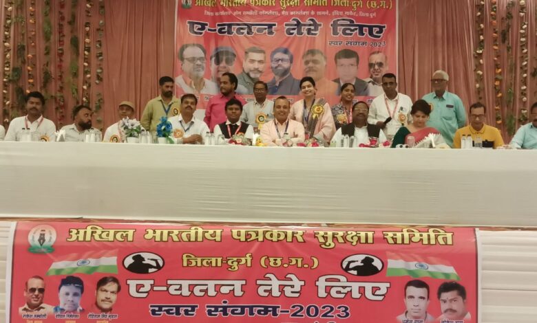 दुर्ग :- अखिल भारतीय पत्रकार सुरक्षा समिति जिला दुर्ग के बैनर तले ए वतन तेरे लिए, स्वर संगम 2023 जनता के लिए कार्यक्रम का आयोजन पृथ्वी पैलेस शिवनाथ नदी के पास,ग्राम अंजोरा ,नगपुरा मोड़ के पास, राजनांदगांव रोड में संपन्न हुआ। लाभचंद बाफना पूर्व विधायक साजा, संसदीय सचिव एवं सावला राम डहरे पूर्व विधायक अहिवारा की उपस्थिति में कार्यक्रम का शुभारंभ हुआ। अतिथियो द्वारा सर्वप्रथम मां सरस्वती की पूजा अर्चना, माल्यार्पण कर कार्यक्रम की शुरुआत की गई ।