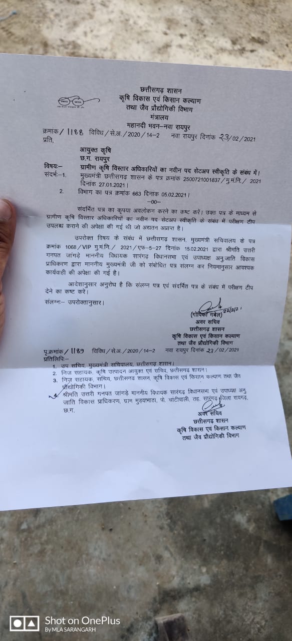 अपनी समस्याओं को लेकर जब कृषि अधिकारीयों ने सारंगढ़ विधायक उत्तरी गणपत जांगड़े से बात की तो संवेदनशील विधायक ने तत्काल मुख्यमंत्री भूपेश बघेल को पत्र लिखा।