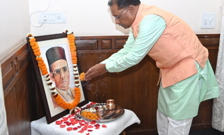 रायपुर:-मुख्यमंत्री श्री विष्णु देव साय ने आज यहां राज्य अतिथि गृह पहुना में क्रांतिकारी श्री विनायक दामोदर सावरकर की पुण्यतिथि पर उनके छायाचित्र पर पुष्प अर्पित कर उन्हें नमन किया ।
