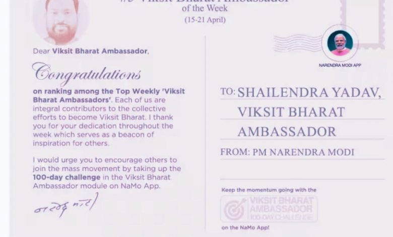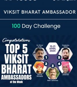 शीर्ष साप्ताहिक ‘विकसित भारत राजदूतों’ में रैंकिंग पर। हममें से प्रत्येक विकसित भारत बनने के सामूहिक प्रयासों में अभिन्न योगदानकर्ता है। मैं पूरे सप्ताह आपके समर्पण के लिए धन्यवाद देता हूं जो दूसरों के लिए प्रेरणा का स्रोत है।