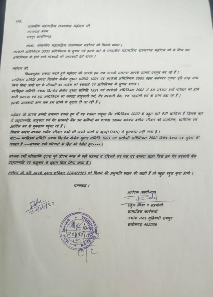 सरफेसी अधिनियम 2002 अधिनियम में सुधार एवं इसके बारे में माननीय महामहिम राज्यपाल महोदय जी से मिल कर अधिनियम से होने वाले परेशानी की जानकारी देने समय देने की मांग.