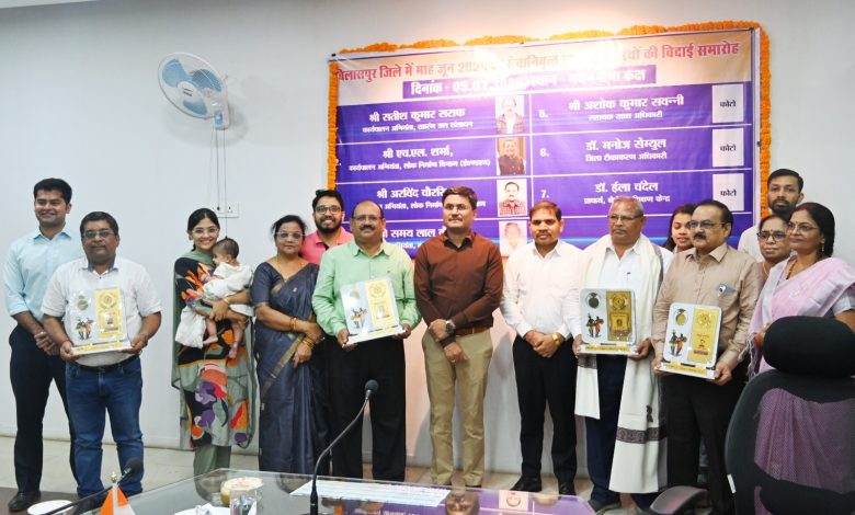 बिलासपुर, 5 जुलाई 2024/शासन के विभिन्न विभागों में पदस्थ वरिष्ठ अधिकारियों की सेवानिवृत्ति पर आज जिला कार्यालय में आयोजित कार्यक्रम में उन्हें सामूहिक रूप से भावभीनी बिदाई दी गई। कार्यक्रम में अधिकारियों के परिवारजन भी शामिल हुए। इन अधिकारियों में जल संसाधन विभाग के कार्यपालन अभियंता श्री सतीश सराफ, पीडब्ल्यूडी ई.एन.एम के कार्यपालन अभियंता श्री एच.एल.शर्मा, पीडब्ल्यूडी संभाग क्रमांक 02 के कार्यपालन अभियंता श्री अरविंद चौरसिया, आरईएस के कार्यपालन अभियंता श्री समय लाल कैवर्त, जिला टीकाकरण अधिकारी श्री मनोज सैमुअल, सहायक खाद्य अधिकारी श्री अशोक सवन्नी एवं श्रेत्रीय प्रशिक्षण केन्द्र की प्राचार्य डॉ. ईला चंदेल शामिल है। जिला प्रशासन की ओर से कलेक्टर श्री अवनीश शरण ने सभी अधिकारियों को शॉल, श्रीफल एवं स्मृति चिन्ह देकर सम्मानित किया। कलेक्टर ने सभी के सेवाकाल का स्मरण करते हुए उनके स्वस्थ, सुखद एवं दीर्घायु जीवन के लिए शुभकामनाएं दी। सभी अधिकारियों ने अपने लंबी सेवाकाल के रोचक अनुभव साझा किए। इस अवसर पर जिला पंचायत सीईओ श्री आरपी चौहान एवं सहायक कलेक्टर श्री तन्मय खन्ना ने भी सभी के कार्य की सराहना करते हुए उन्हें सुखद भविष्य की शुभकामनाएं दी।