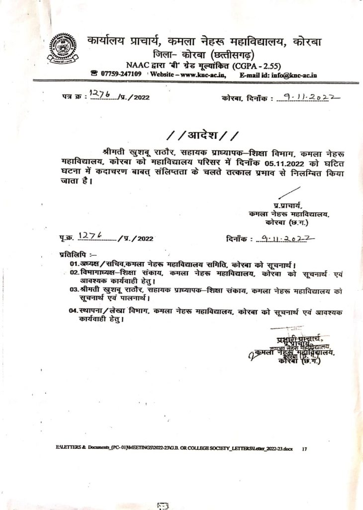 5 नवंबर 2022 की दोपहर सहायक प्राध्यापक अभिषेक तिवारी की पत्नी अचानक अपने पिता के साथ कॉलेज पहुंची और सीधे साइंस लैब पहुंच गई। वहां दोनों सहायक प्राध्यापको को संदिग्थ परिस्थितियों में देखकर पत्नी ने आपा खो दिया और सहायक प्राध्यापिका को जमकर खरी खोटी सुनाई । इसके बाद अपने पति को खींचते हुए घर ले आयी। इस मामले को तूल पकड़ता देख महाविद्यालय प्रबंधन ने दोनों सहायक प्राध्यापकों को कदाचरण के आरोप में निलंबित कर दिया । आदेश की कॉपी आप भी देखें: