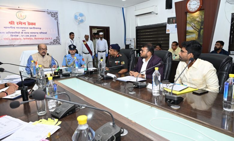 राज्यपाल ने जनजातीय क्षेत्र में रहने वाले लोगों को समाज की मुख्य धारा से जोड़ने एवं स्वास्थ्य, शिक्षा सहित अन्य आधारभूत सेवाएं उपलब्ध कराने के लिए विशेष प्रयास करने की बात कहीं। उन्होंने जनजातीय क्षेत्रों में सहकारी गतिविधि बढ़ाने के लिए भी कहा ताकि अंचल में रहने वाले लोगों को सशक्त बनाते हुए मुख्य धारा से जोड़ा जा सके। इसके साथ-साथ उन्होंने सभी अधिकारियों को अपने विभागीय दायित्वों को पूरी कर्तव्य निष्ठा के साथ निर्वहन करने तथा बेहतर नवाचार के साथ कार्य करने के लिए प्रोत्साहित किया। बैठक में एनसीसी के कमाण्ड अधिकारी श्री अमित श्रीवास्तव, जिला पंचायत के मुख्य कार्यपालन अधिकारी श्री रामप्रसाद चौहान, नगर निगम कमिश्नर श्री अमित कुमार, एडीएम श्री आर.ए. कुरूवंशी सहित सभी विभागों के जिलास्तरीय अधिकारी मौजूद रहें।