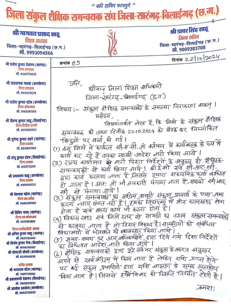 सारंगढ :-संकुल शैक्षिक समन्वयक संघ जिला सारंगढ़ बिलाईगढ़ ने एल पी पटेल डीईओ सारंगढ़ बिलाईगढ़ को विभिन्न मांगों के संबंध में ज्ञापन सौंपा।राज्य परियोजना समग्र शिक्षा रायपुर के आदेश के अतिरिक्त कार्य संकुल समन्वयकों से कराया जा रहा है। जिसका विरोध समन्वयकों के द्वारा किया गया। कार्यवाहक के रुप से कार्यरत समन्वयकों का स्थायी आदेश कई बार ज्ञापन देने के बाद भी आज पर्यन्त तक जारी न होने पर भारी नाराजगी जताई गई एवं अन्य मांगों व समस्याओं से अवगत कराया गया।इस अवसर पर जिला अध्यक्ष भागवत प्रसाद साहू, जिला उपाध्यक्ष राजेश देवांगन, जिला सचिव डाबर सिंह साहू, जिला प्रवक्ता शंभू टंडन, जिला मिडिया प्रभारी चैतन्यकुमार साहू, विपिन भगत कोषाध्यक्ष,भगत राम पटेल ब्लॉक अध्यक्ष सारंगढ़, आलोक डनसेना ब्लॉक