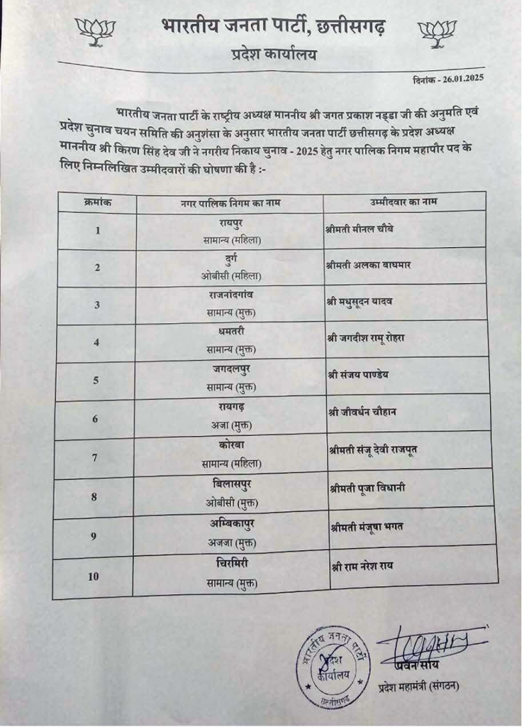 भाजपा ने महापौर लिस्ट जारी की, नगरी निकाय को लेकर कांग्रेस से पहले पार्षद के बाद महापौर की टिकिट जारी की. 5महिला एवं 5पुरुषो पर पार्टी ने महापौर पर मोहर लगाई।