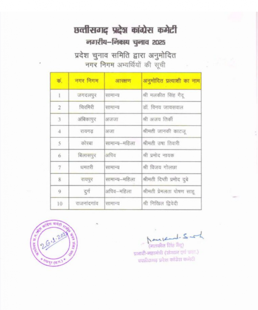 बिलासपुर से प्रमोद नायक को महापौर तो रायपुर से दीप्ती प्रमोद दुबे को महापौर क़ी टिकिट दी।