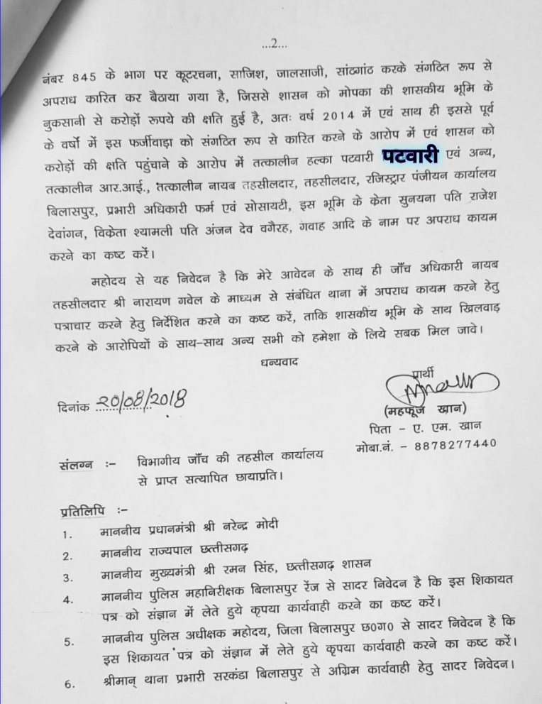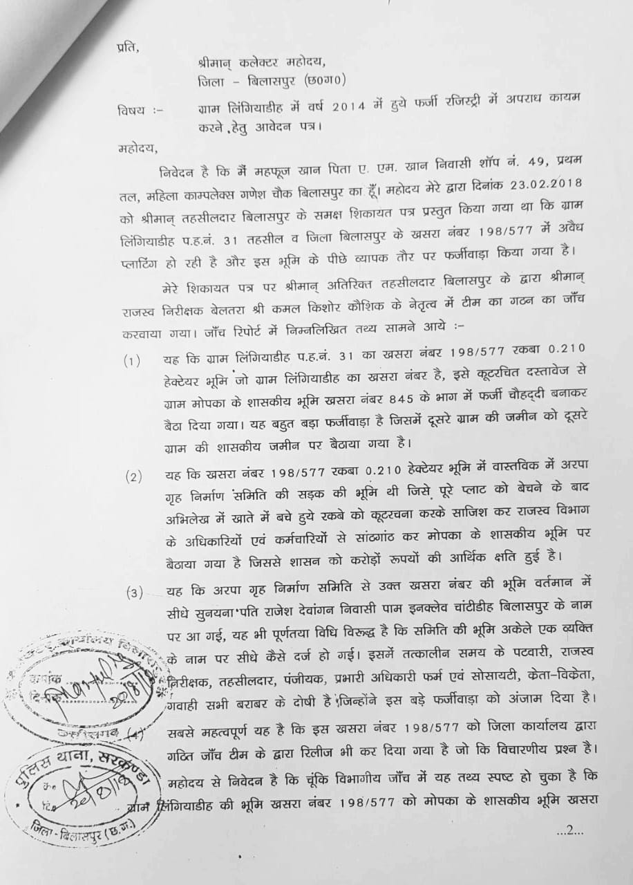 समाजिक कार्यकर्ता नेवर्ष 2018 में कलेक्टर बिलासपुर को की थी शिकायत पूर्व में बिलासपुर तहसील में प्रकरण दर्ज ?