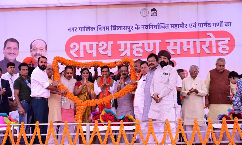 बिलासपुर, 28 फरवरी 2025/ उप मुख्यमंत्री श्री अरुण साव, केंद्रीय शहरी विकास राज्य मंत्री श्री तोखन साहू की उपस्थिति में नगर पालिक निगम, बिलासपुर के नव निर्वाचित महापौर एवं पार्षदों का शपथ ग्रहण समारोह आज मुंगेली नाका मैदान में संपन्न हुआ। कलेक्टर श्री अवनीश शरण ने महापौर एवं सभी पार्षदों को वार्डवार शपथ दिलाई।महापौर श्रीमती पूजा विधानी ने मंत्रियों और विधायकों की उपस्थिति में महापौर पद की शपथ ली। इसके बाद पार्षदों को 10 – 10 के समूह में शपथ दिलाई गई। शपथ ग्रहण उपरांत महापौर श्रीमती पूजा विधानी ने उप मुख्यमंत्री श्री अरुण साव, केंद्रीय शहरी विकास राज्य मंत्री श्री तोखन साहू, विधायक श्री अमर अग्रवाल, श्री धरमलाल कौशिक,श्री धरमजीत सिंह, श्री सुशांत शुक्ला एवं विशिष्ट अतिथियों को स्मृति चिन्ह भेंट कर सम्मानित किया। नगर निगम आयुक्त श्री अमित कुमार ने सभी अतिथियों, जनप्रतिनिधियों एवं शहरवासियों के प्रति आभार व्यक्त किया।
