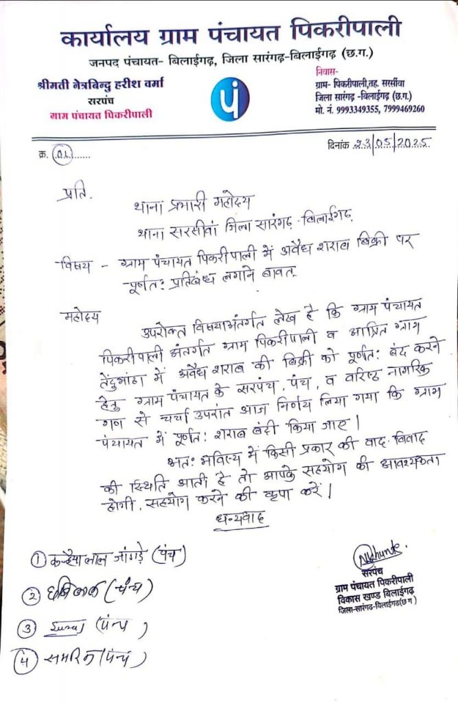 ने बताया कि ग्राम पंचायत पिकरीपाली से अवैध शराब की बिक्री को लेकर ज्ञापन पत्र प्राप्त हुआ है। जिसमें हमारे द्वारा अवैध शराब विक्रेताओं पर कड़ी कार्रवाई किया जाएगा