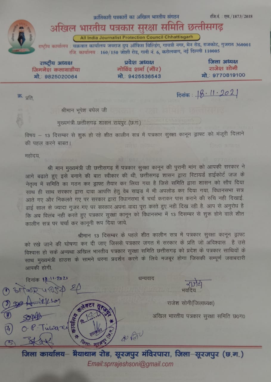 आप से अनुरोध है कि अब विलंब नही करते हुए पत्रकार सुरक्षा कानून को विधानसभा में 13 दिसम्बर से शुरू होने वाले शीत कालीन सत्र पर चर्चा कर कानूनी रूप दिया जाये। श्रीमान 13 दिसम्बर के पहले शीत कालीन सत्र में पत्रकार सुरक्षा कानून ड्राफ्ट को रखे जाने की घोषणा कर दी जाए जिससे पत्रकार जगत में सरकार के प्रति जो अविश्वास है उसे विश्वास हो सके ।