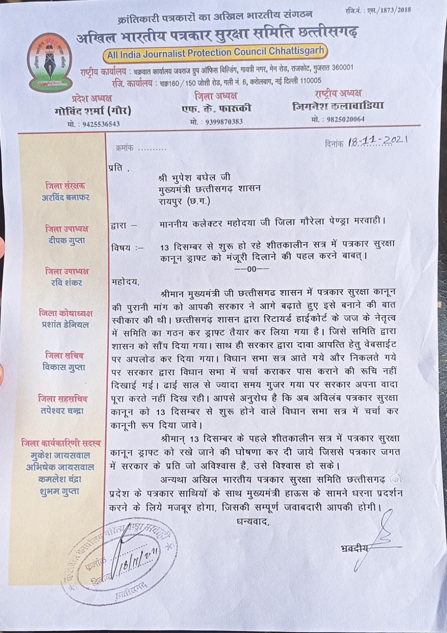 रायपुर/बिलासपुर-: प्रदेश में पत्रकार सुरक्षा कानून की लड़ाई को लगातार जारी रखे हुए अखिल भारतीय पत्रकार सुरक्षा समिति छत्तीसगढ़ ने सरकार को इस शीत कालीन सत्र पर विधानसभा में कानून को लागू करने की मांग को लेकर प्रदेश स्तरीय जिला,ब्लॉक में पत्रकारों द्वारा ज्ञापन सौंपा जा रहा है जिसमे बिलासपुर,सूरजपुर,गौरेला-पेंड्रा-मरवाही जिला मुख्यालय में ज्ञापन सौपा गया।