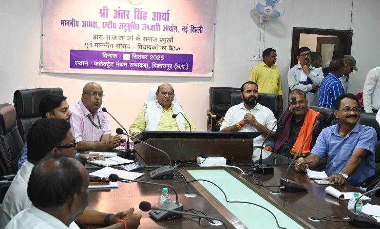 बिलासपुर, 14 सितम्बर 2025/केन्द्रीय अनुसूचित जनजाति आयोग के अध्यक्ष श्री अंतर सिंह आर्या ने आज यहां जिला कार्यालय के मंथन सभाकक्ष में आदिवासी समाज प्रमुखों की बैठक ली। लगभग दो घण्टे तक चली बैठक में उन्होंने इत्मीनान से उनकी एक-एक समस्याएं सुनी और इस संबंध में ज्ञापन भी लिए। श्री आर्या ने कहा कि बैठक में आज आदिवासी समाजों की ओर से महत्वपूर्ण सुझाव मिले हैं। ये सभी कानूनी एवं विभिन्न संवैधानिक मुद्दों से जुड़े हुए हैं। इन सभी को राष्ट्रपति और राज्यपाल के ध्यान में लाकर उनका सकारात्मक समाधान किया जायेगा। आयोग के वरिष्ठ अधिकारी एवं विशेषज्ञ भी इस दौरान उपस्थित थे।