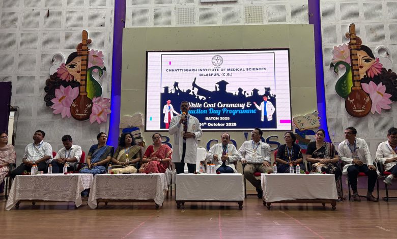 बिलासपुर :- छत्तीसगढ़ इंस्टिट्यूट ऑफ मेडिकल साइंसेज़ (सिम्स), बिलासपुर में दिनांक 4 अक्टूबर 2025 को एमबीबीएस बैच 2025-26 के लिए इंडक्शन डे एवं वाइट कोट सेरेमनी उत्साहपूर्वक आयोजित की गई। कार्यक्रम का शुभारंभ दीप प्रज्वलन एवं सरस्वती वंदना के साथ हुआ।