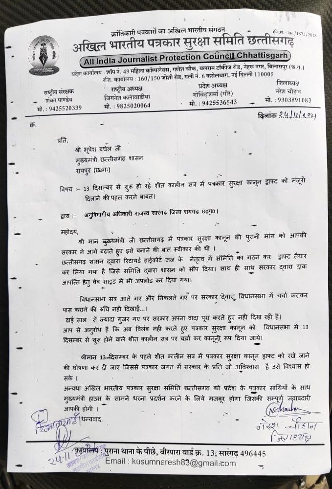 सारंगढ़ :- पत्रकारों पर लगातार बढ़ते हमलों को देखते हुए पत्रकारों की सुरक्षा को लेकर अलग से कानून बनाए जाने की मांग अब और तेज हो गई है। पत्रकार सुरक्षा कानून की लड़ाई अखिल भारतीय पत्रकार सुरक्षा समिति छत्तीसगढ़ ने जारी रखा है। मुख्यमंत्री भूपेश बघेल जी आपने कहा था अगर छत्तीसगढ़ में कांग्रेस की सरकार आती हैं तो पत्रकार सुरक्षा कानून लागू होगा। आज छत्तीसगढ़ में आपकी सरकार हैं और लगभग ढाई साल पूरे हो गए हैं फिर भी आज पर्यन्त तक पत्रकार सुरक्षा कानून लागू नहीं किया गया हैं सरकार अपना वादा पूरा करते नहीं दिख रही हैं पत्रकारों की सुरक्षा से जुड़ा कानून जल्द लागू किया जाए। पत्रकार सुरक्षा कानून लागू होने से पत्रकारों की सुरक्षा सुनिश्चित की जा सकेगी, जो जीवन को खतरे में डालकर पत्रकारिता कर रहे हैं। भ्रष्टाचार में लिप्त अधिकारियों, माफिया, नेताओं और अपराधिक तत्वों को उजागर करने वाले पत्रकारों के लिए सुरक्षा आवश्यक है। पत्रकारों की सुरक्षा से कोई समझौता नही किया जाएगा। पत्रकार के जीवन पर छाये हर पल खतरे को देखते हुए एक विशिष्ट कानून की जरूरत है जिससे कानून और व्यवस्था से जुड़े अधिकारी डर के बिना अपनी जिम्मेदारी निभा सकें।टीवी न्यूज चैनलों, ऑनलाइन मीडिया, मोबाइल फोन आदि ने पूरी तरह से देश में मीडिया का परिदृश्य बदल दिया है। मीडिया और पत्रकारों के सामने आज जो चुनौतियां है वह बहुत बदल गई हैं। आधिकारिक तौर पर वास्तविक स्थिति को समझने के लिए अभी तक किसी प्रकार का अध्ययन नहीं किया गया है। वहीं अखिल भारतीय पत्रकार सुरक्षा समिति सारंगढ़ इकाई के नवगठित जिला सारंगढ़ के जिला अध्यक्ष नरेश चौहान ने स्पष्ट कहा कि इस समय छत्तीसगढ़ मीडिया काउंसिल के गठन की जरूरत महसूस की जा रही है। आगामी शीतकालीन सत्र 13 दिसम्बर से शुरू होने वाला हैं उस दौरान पत्रकार सुरक्षा क़ानून लागू नहीं होता है तो CM हाउस छत्तीसगढ़ में पूरे छत्तीसगढ़ के पत्रकार साथी आंदोलन के लिए बाध्य रहेंगे जिसकी सम्पूर्ण जवाबदारी आपकी रहेगी।