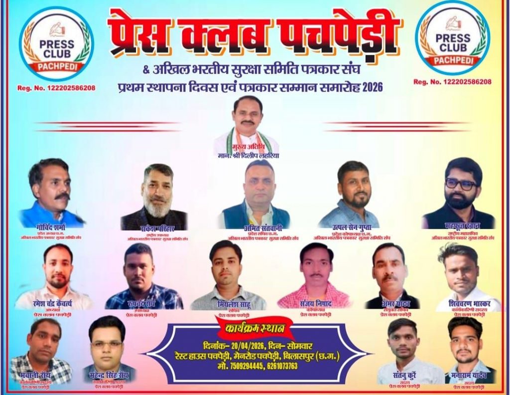 पचपेड़ी। बिलासपुर जिले के पचपेड़ी में प्रेस क्लब का शपथ समारोह 20 अप्रैल 2026, सोमवार को दोपहर 12 बजे आयोजित किया जाएगा। यह कार्यक्रम रेस्ट हाउस पचपेड़ी, मेन रोड पचपेड़ी में संपन्न होगा। आयोजन प्रेस क्लब पचपेड़ी एवं अखिल भारतीय पत्रकार सुरक्षा समिति के तत्वावधान में किया जा रहा है।